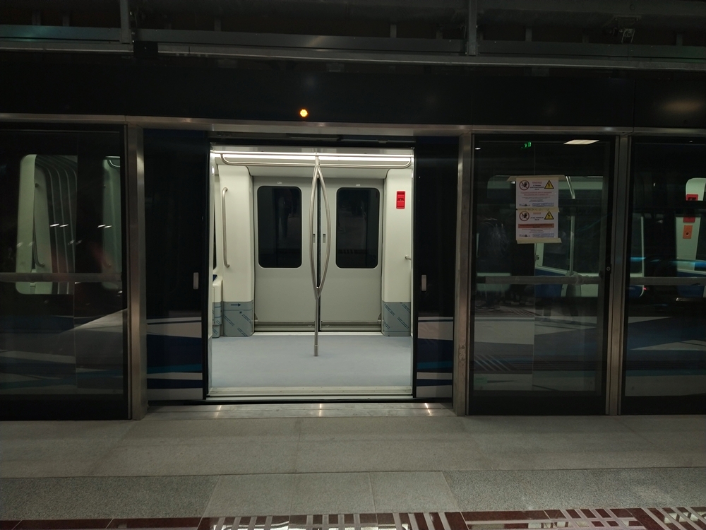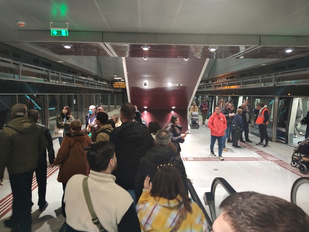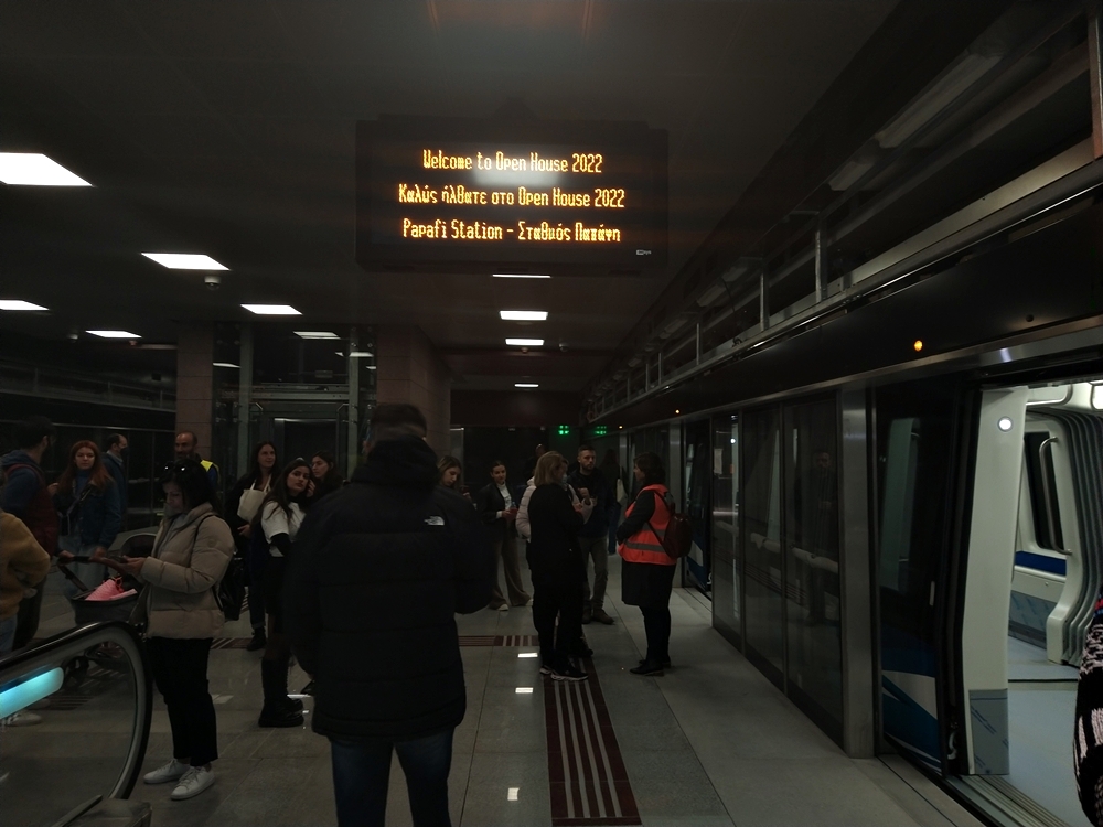 Η επόμενη έκπληξη που περιμένει τους επισκέπτες, είναι όταν κατεβαίνουν και τις επόμενες σκάλες και βρίσκονται στην αποβάθρα και μπροστά στους υπερσύγχρονους, αυτόματους συρμούς του μετρό που, με ανοιχτές τις πόρτες, υποδέχτηκαν τους πρώτους «επιβάτες» τους για μία νοητή βόλτα και μία πρώτη εξοικείωση με το μέσο μεταφοράς που έχει στηρίξει όλες της τις ελπίδες μία ολόκληρη πόλη.