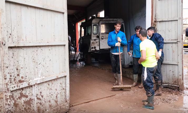 Τον Ναδάλ κατέγραψαν οι κάμερες των ισπανικών Μέσων Ενημέρωσης να φορά γάντια και γαλότσες και μαζί με άλλους εθελοντές να συνδράμει στον καθαρισμό ενός πλημμυρισμένου συνεργείου αυτοκινήτων.