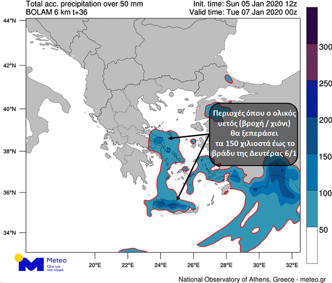 Παράλληλα, οι ισχυρές βροχές στην Κρήτη και οι χιονοπτώσεις στα ορεινά αυτής καθώς και οι βροχοπτώσεις στη Εύβοια και οι χιονοπτώσεις που αναμένονται τις επόμενες ώρες θα συνεχιστούν και τη Δευτέρα 6/1. Ιδιαίτερα για την Κρήτη υπάρχει ενδεχόμενο να δημιουργηθούν κατά τόπους προβλήματα λόγω του κορεσμού του εδάφους σε νερό και των μεγάλων ποσοτήτων υετού που αναμένονται. Στο σχετικό χάρτη παρουσιάζονται οι περιοχές στις οποίες αναμένονται τα μεγαλύτερα πόσα ολικού υετού (βροχή / χιόνι) έως το βράδυ της Δευτέρας 6/1.