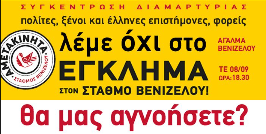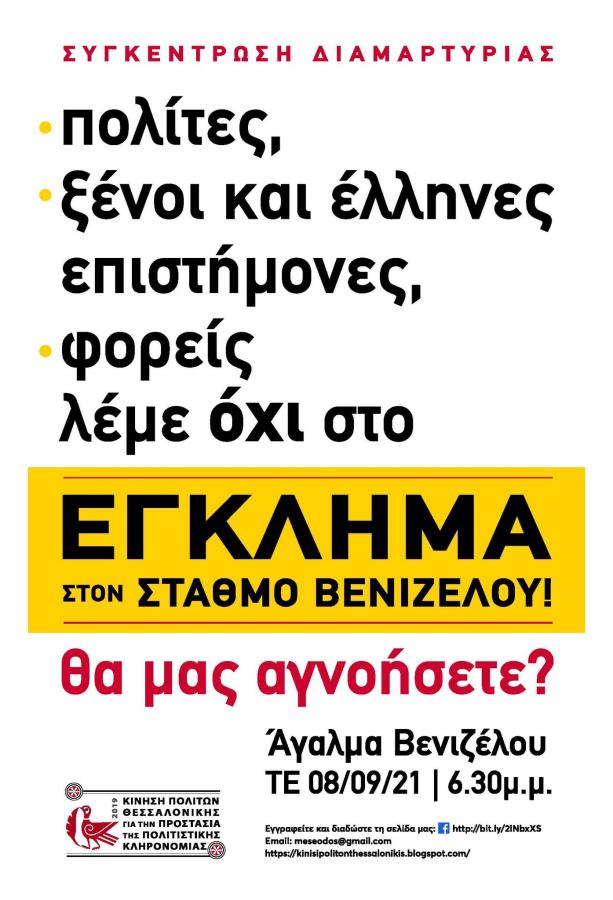 Η Κίνηση Πολιτών Θεσσαλονίκης για την Προστασία της Πολιτιστικής Κληρονομιάς καλεί φορείς, επιστήμονες και όλους τους πολίτες που αντιτίθενται στην απόσπαση των αρχαιοτήτων του σταθμού Βενιζέλου σε μαζική συγκέντρωση διαμαρτυρίας την Τετάρτη 8/9, στις 6.30 μμ στο Άγαλμα Βενιζέλου.