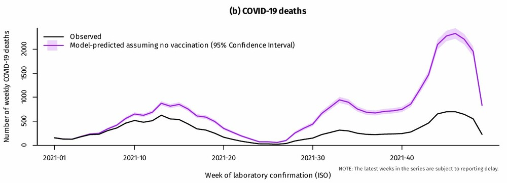 «Αν ο εμβολιασμός δεν ήταν διαθέσιμος, η πανδημία θα είχε πολύ σοβαρότερες επιπτώσεις, ιδίως κατά τη διάρκεια του μεγάλου κύματος της Δέλτα τον χειμώνα του 2021. Καθ’όλη τη διάρκεια της μελέτης, ο εμβολιασμός απέτρεψε περίπου 19,691 θανάτους από Covid (95% CI: 18,890-20,788) και 6,674 διασωληνώσεις (95% CI: 6,251-7,241)» αναφέρεται στη μελέτη.