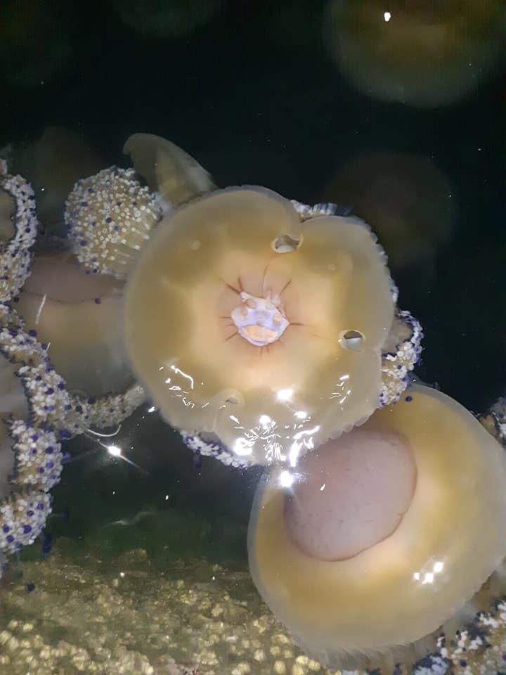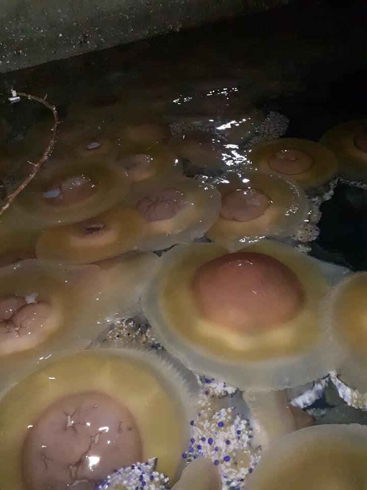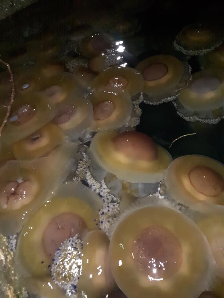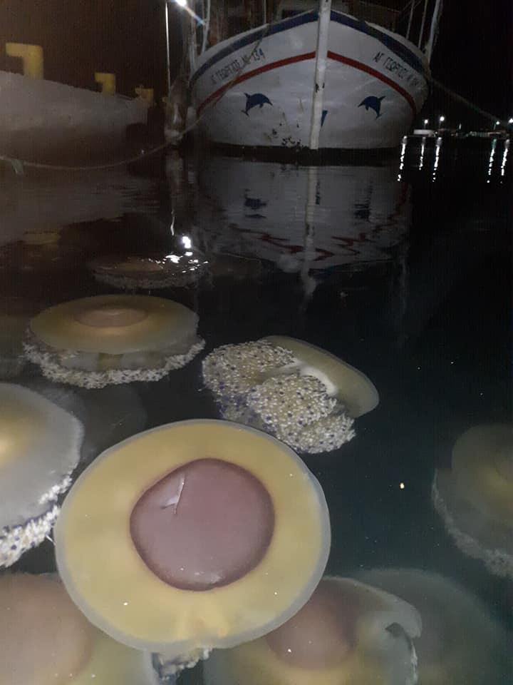 Κοπάδι μεδουσών του είδους Cotylorhiza tuberculata αντίκρισαν χθες το βράδυ στη θάλασσα των Νέων Μουδανιών οι διερχόμενοι/ λουόμενοι.