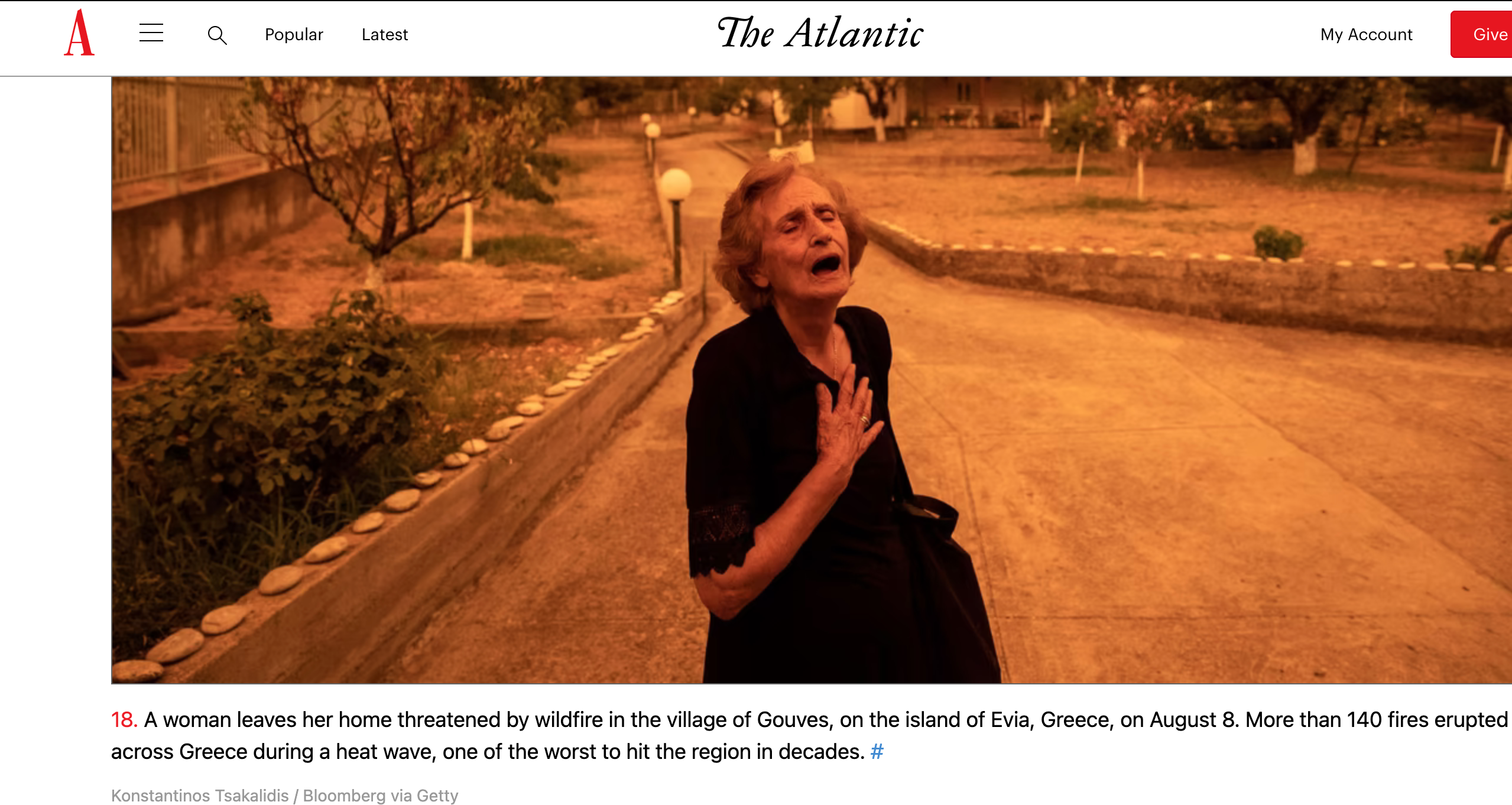 Η εικόνα να θυμίσουμε πως τραβήχτηκε στις Γούβες της Εύβοιας και εικονίζει μια ηλικιωμένη γυναίκα που θρηνεί μπροστά στο καμένο της χωριό. Πρόσφατα το Time την ενέταξε στις 100 εικόνες βάζοντας την μάλιστα ως ένα από τα 4 διαδικτυακά του εξώφυλλα για το τέλος της χρονιάς.