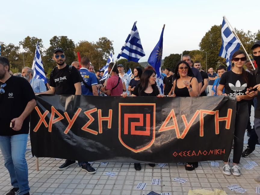 Στο σημείο βρίσκονται και μέλη της Χρυσής Αυγής με σημαίες και πανό του κόμματος, καθώς και μέλη του Ιερού Λόχου.