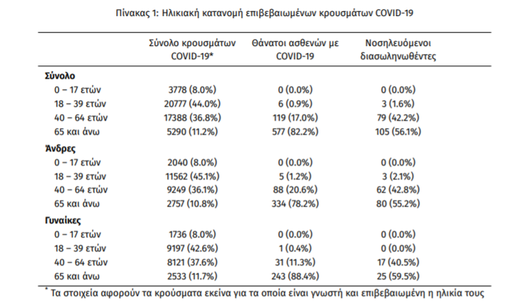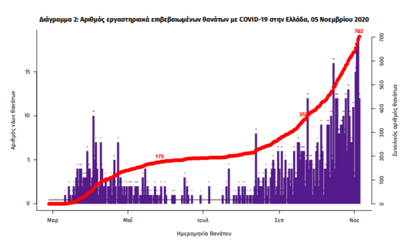 Τέλος, έχουμε 29 ακόμα καταγεγραμμένους θανάτους και 702 θανάτους συνολικά στη χώρα. 275 (39.2%) γυναίκες και οι υπόλοιποι άνδρες. Η διάμεση ηλικία των θανόντων συμπολιτών μας ήταν τα 79 έτη και το 96.6% είχε κάποιο υποκείμενο νόσημα ή/και ηλικία 70 ετών και άνω.