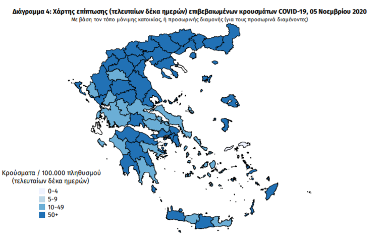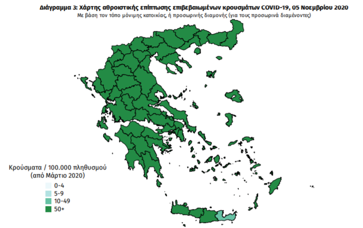 Ο χάρτης αποτυπώνει τη γεωγραφική κατανομή των συνολικών κρουσμάτων COVID-19 (από την αρχή της επιδημίας) ανά Περιφερειακή Ενότητα της χώρας, με βάση την δηλωθείσα διεύθυνση μόνιμης κατοικίας του ασθενούς, ή τη διεύθυνση προσωρινής διαμονής για τους τουρίστες και άλλους προσωρινά διαμένοντες στην Ελλάδα. Συμπεριλαμβάνονται τόσο κρούσματα με ιστορικό ταξιδίου (“εισαγόμενα”) όσο και κρούσματα με πιθανή εγχώρια μετάδοση
