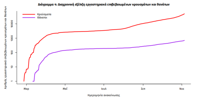 Η διαχρονική εξέλιξη των συνολικών κρουσμάτων και συνολικού αριθμού των θανάτων ασθενών COVID-19 παρουσιάζεται στο ακόλουθο διάγραμμα (σε λογαριθμική κλίμακα).