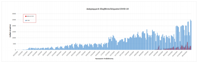 Δείγματα που έχουν ελεγχθεί: Από την 1η Ιανουαρίου 2020 μέχρι σήμερα, στα εργαστήρια που διενεργούν ελέγχους για τον νέο κορωνοϊό (SARS-CoV-2) και που δηλώνουν συστηματικά στον ΕΟΔΥ το σύνολο των δειγμάτων που ελέγχουν, έχουν συνολικά ελεγχθεί 1876471 κλινικά δείγματα ενώ από Μονάδες Υγείας και Κλιμάκια του ΕΟΔΥ που διενεργούν ελέγχους Rapid Ag έχουν ελεγχθεί 83567 δείγματα.