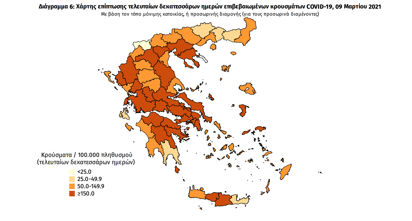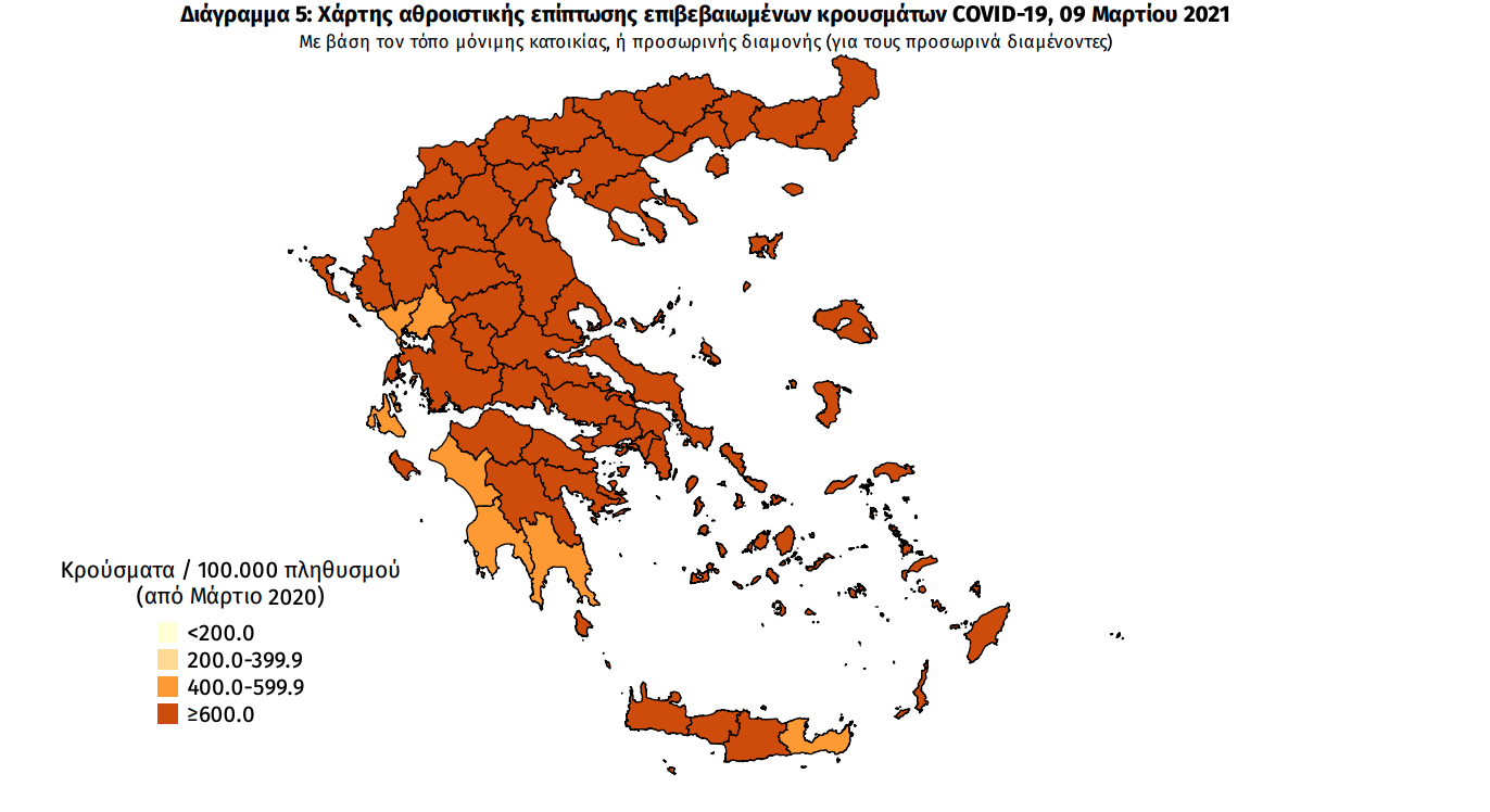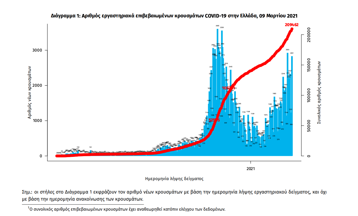 Τα στοιχεία που παρουσιάζονται αφορούν περιστατικά από την επιδημιολογική επιτήρηση της νόσου από το νέο κορωνοϊό (COVID19), με βάση τα δεδομένα που έχουν δηλωθεί στον ΕΟΔΥ και καταγραφεί μέχρι τις 09 Μαρτίου 2021 (ώρα 15:00). Τα νέα εργαστηριακά επιβεβαιωμένα κρούσματα της νόσου που καταγράφηκαν τις τελευταίες 24 ώρες είναι 3.215, εκ των οποίων 21 εντοπίστηκαν κατόπιν ελέγχων στις πύλες εισόδου της χώρας.