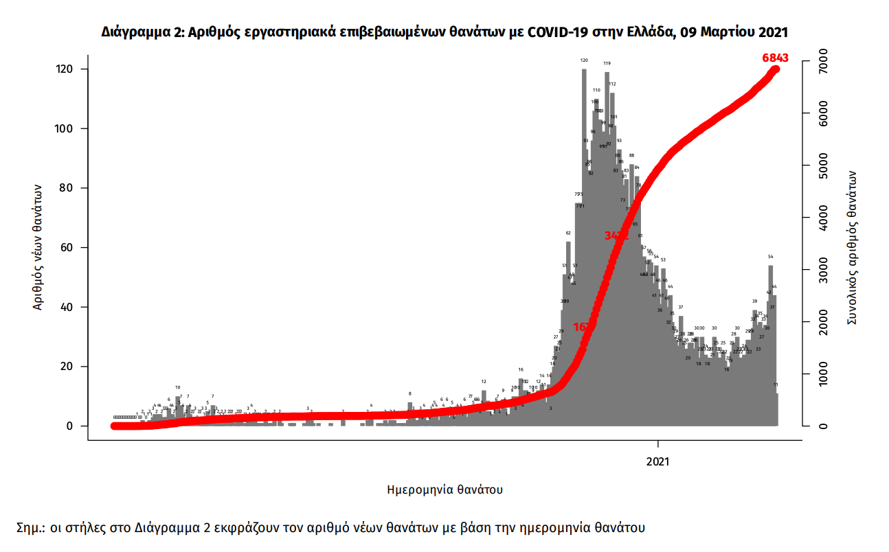 Οι νέοι θάνατοι ασθενών με COVID-19 είναι 46, ενώ από την έναρξη της επιδημίας έχουν καταγραφεί συνολικά 6.843 θάνατοι. Το 95.8% είχε υποκείμενο νόσημα ή/και ηλικία 70 ετών και άνω.