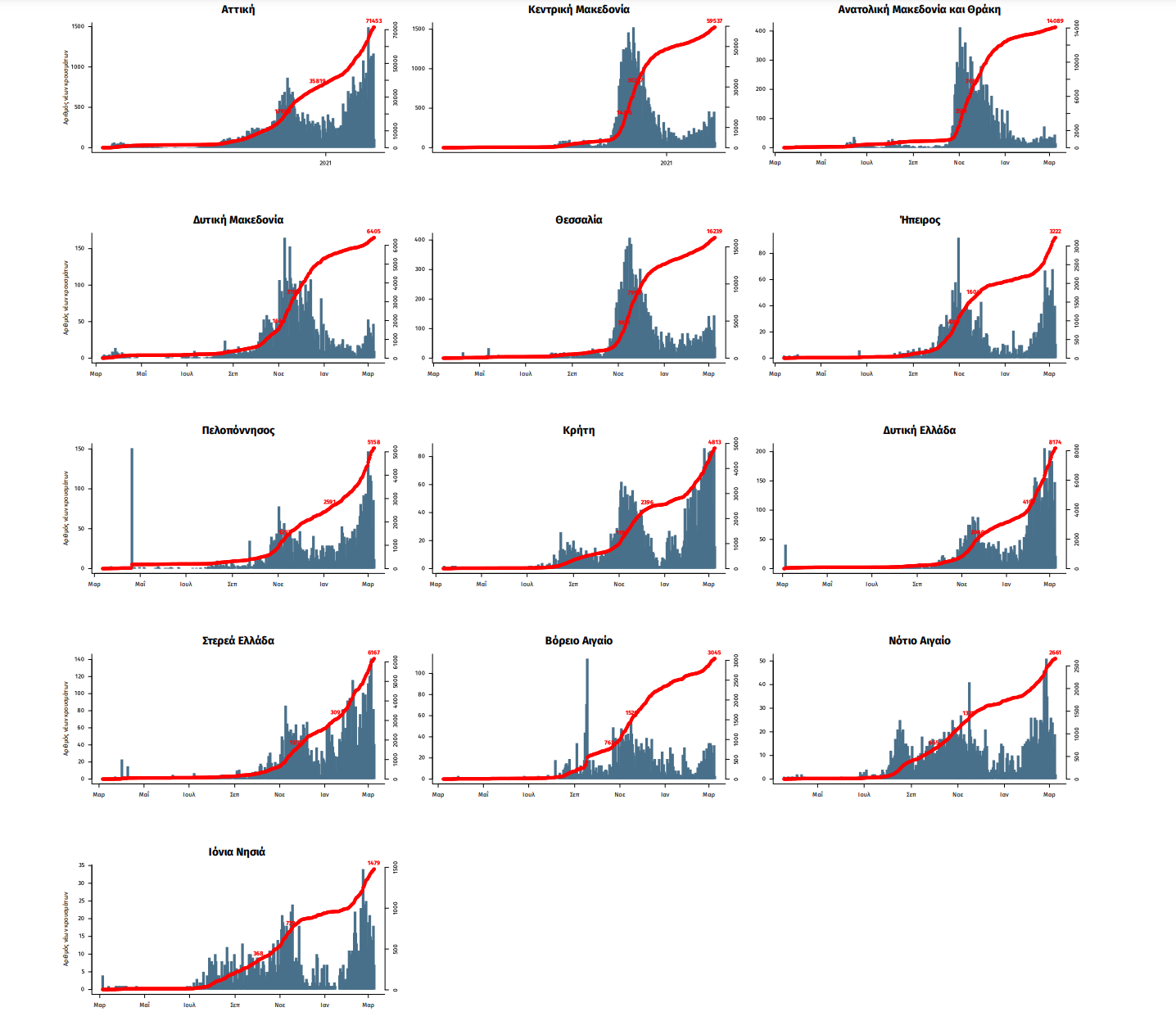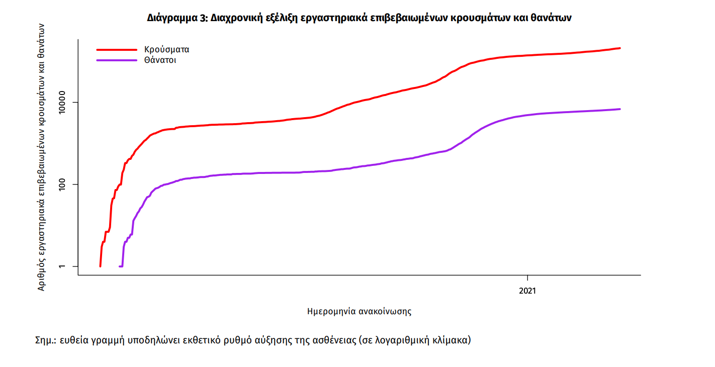 Η διαχρονική εξέλιξη των συνολικών κρουσμάτων και συνολικού αριθμού των θανάτων ασθενών COVID-19 παρουσιάζεται στο ακόλουθο διάγραμμα.