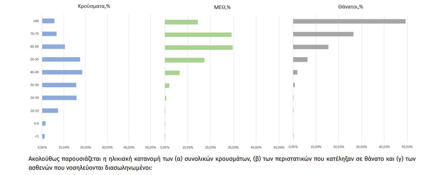 Ακολούθως παρουσιάζεται η ηλικιακή κατανομή των (α) συνολικών κρουσμάτων, (β) των περιστατικών που κατέληξαν σε θάνατο και (γ) των ασθενών που νοσηλεύονται διασωληνωμένοι: