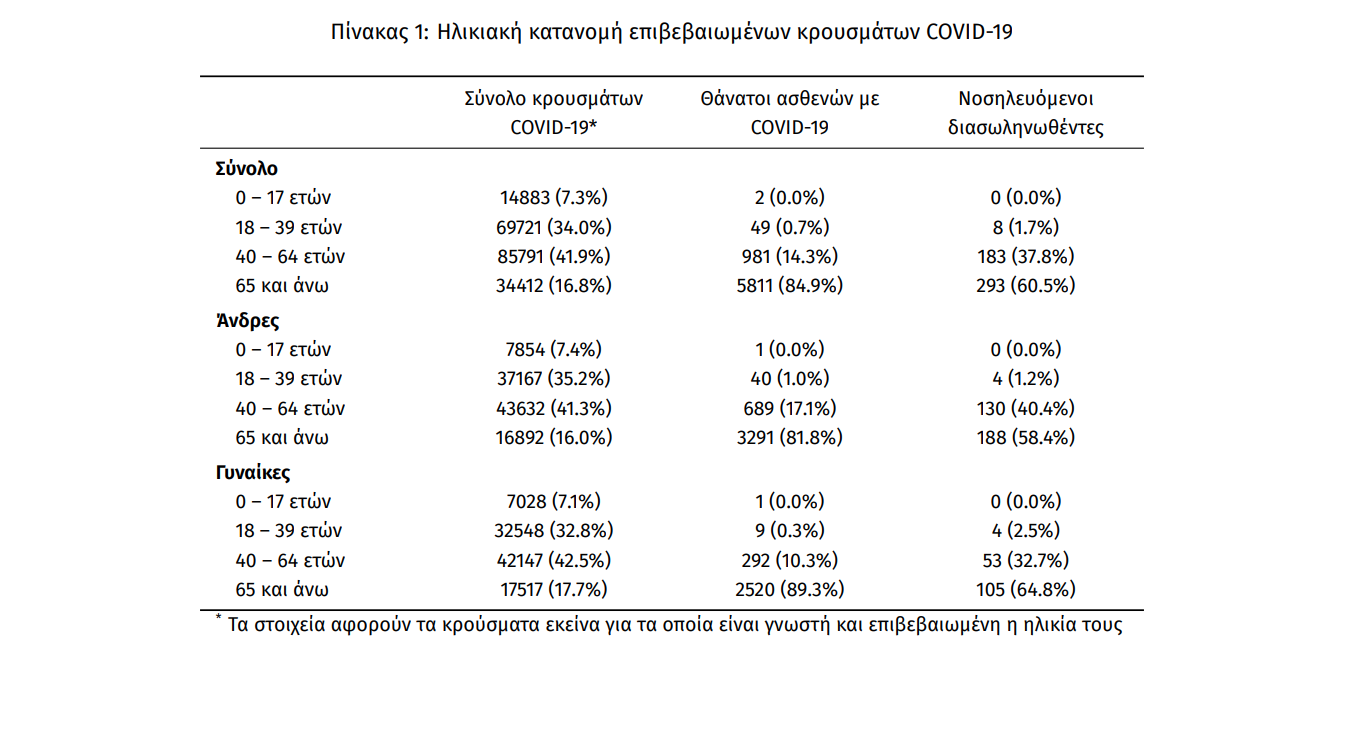 Ο αριθμός των ασθενών που νοσηλεύονται διασωληνωμένοι είναι 484 (66.3% άνδρες). Η διάμεση ηλικία τους είναι 67 έτη. To 84.9% έχει υποκείμενο νόσημα ή/και ηλικία 70 ετών και άνω. Από την αρχή της πανδημίας έχουν εξέλθει από τις ΜΕΘ 1.427 ασθενείς. Οι εισαγωγές2 νέων ασθενών Covid-19 στα νοσοκομεία της επικράτειας είναι 390 (ημερήσια μεταβολή +15.73%). Ο μέσος όρος εισαγωγών του επταημέρου είναι 382 ασθενείς. Hλικιακή κατανομή: Η διάμεση ηλικία των κρουσμάτων είναι 44 έτη (εύρος 0.2 έως 105 έτη), ενώ η διάμεση ηλικία των θανόντων είναι 79 έτη (εύρος 0 έως 103 έτη).
