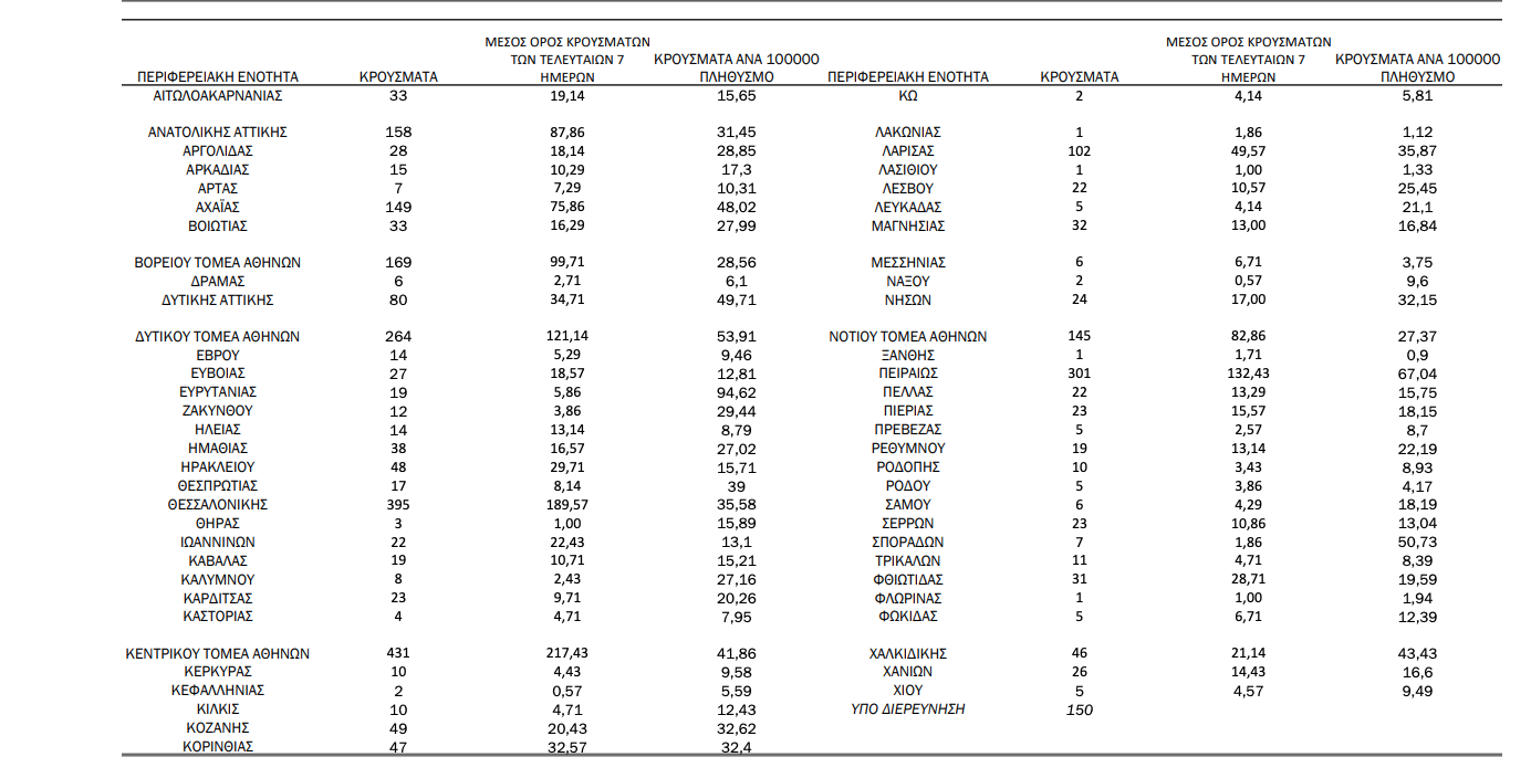 Γεωγραφική διασπορά: Ο χάρτης αποτυπώνει τη γεωγραφική κατανομή των συνολικών κρουσμάτων COVID-19 (από την αρχή της επιδημίας) ανά Περιφερειακή Ενότητα της χώρας, με βάση την δηλωθείσα διεύθυνση μόνιμης κατοικίας του ασθενούς, ή τη διεύθυνση προσωρινής διαμονής για τους τουρίστες και άλλους προσωρινά διαμένοντες στην Ελλάδα. Συμπεριλαμβάνονται τόσο κρούσματα με ιστορικό ταξιδίου (“εισαγόμενα”) όσο και κρούσματα με πιθανή εγχώρια μετάδοση.
