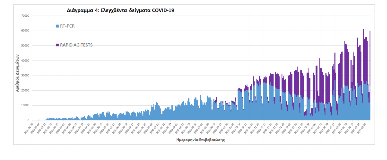 Δείγματα που έχουν ελεγχθεί: Από την 1η Ιανουαρίου 2020 μέχρι σήμερα, στα εργαστήρια που διενεργούν ελέγχους για τον νέο κορωνοϊό (SARS-CoV-2) και που δηλώνουν συστηματικά το σύνολο των δειγμάτων που ελέγχουν, έχουν συνολικά ελεγχθεί 3.835.960 κλινικά δείγματα ενώ από Μονάδες Υγείας και Κλιμάκια του ΕΟΔΥ που διενεργούν ελέγχους Rapid Ag έχουν ελεγχθεί 1.802.079 δείγματα. O μέσος όρος του επταημέρου είναι 46.141 δειγματοληπτικοί έλεγχοι.