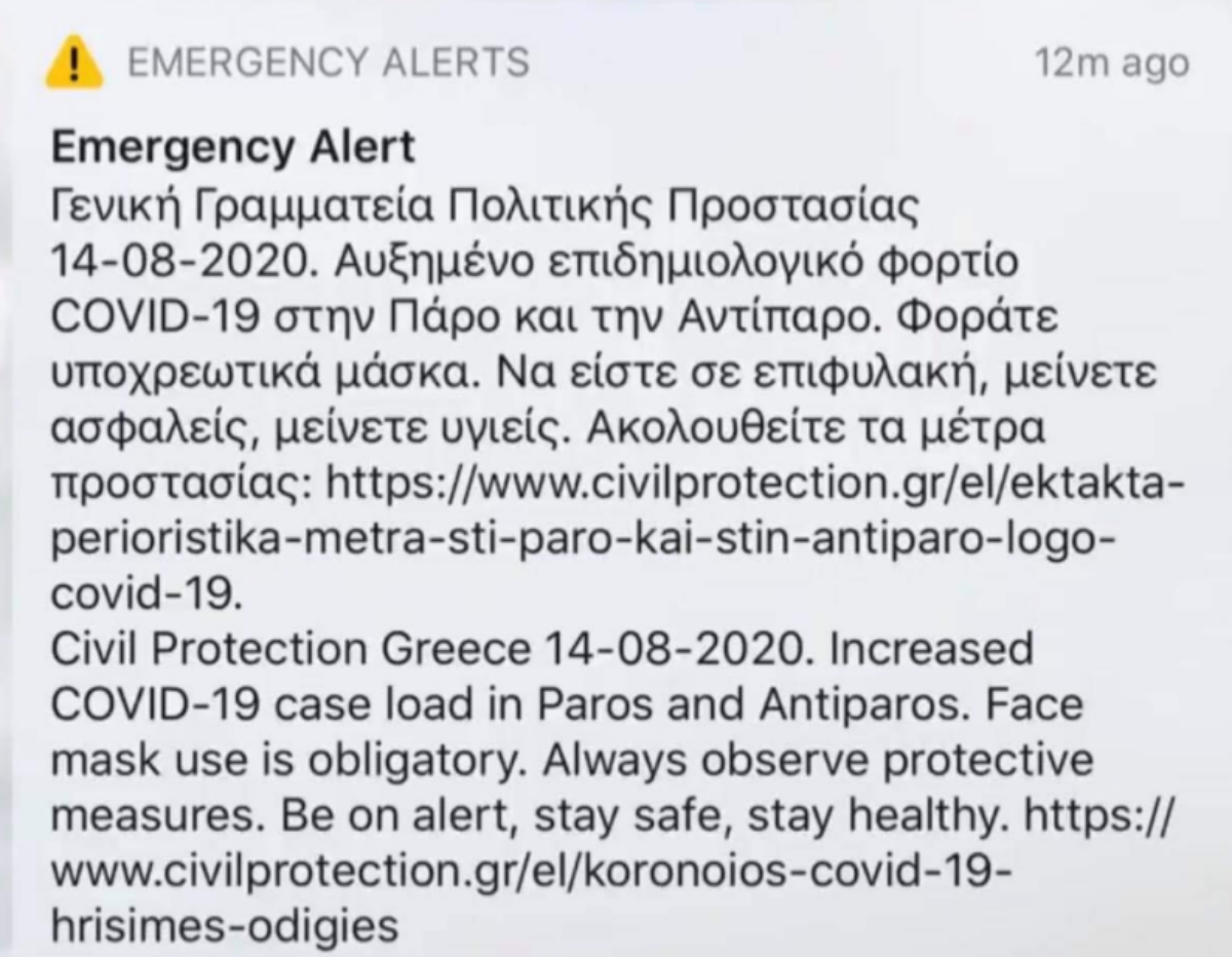 Νέο μήνυμα απέστειλε στους κατοίκους των νησιών Πάρος και Αντίπαρος η Γενική Γραμματεία Πολιτικής Προστασίας μετά τις ανακοινώσεις του υφυπουργού Πολιτικής Προστασίας Νίκου Χαρδαλιά για τα νέα περιοριστικά μέτρα.