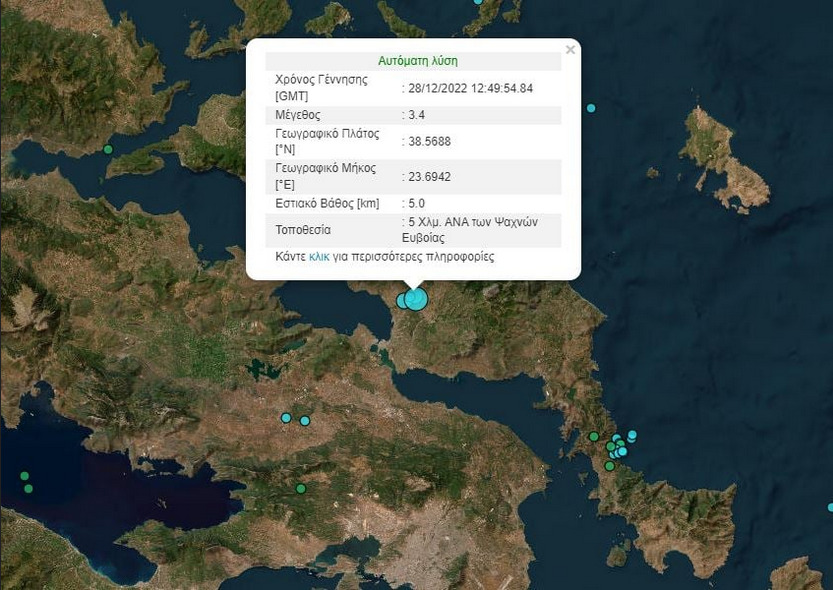 Ο νέος σεισμός είναι μεγέθους 3,5 Ρίχτερ ξανά κοντά στα Ψαχνά -στα τρία χιλιόμετρα- και είχε εστιακό βάθος στα 13 χιλιόμετρα.