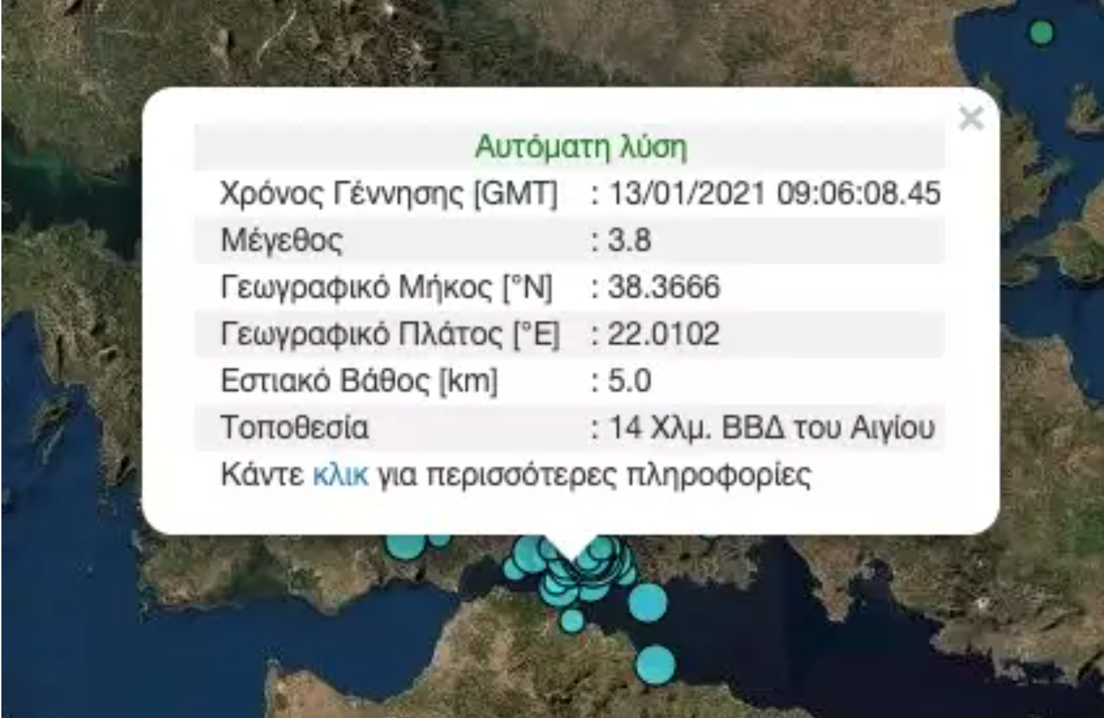 Εξακολουθεί να σείεται η γη στην περιοχή που έγινε ο σεισμός των 4,7 ρίχτερ με επίκεντρο το Μαράθι της Ναυπάκτου. Ο νέος σεισμός έχει μέγεθος 3,8 ρίχτερ και το επίκεντρό του είναι 14 χιλιόμετρα βόρεια βορειοδυτικά του Αιγίου. Το εστιακό του βάθος είναι 5 χιλιόμετρα.