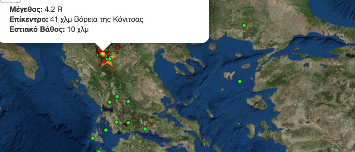 Σεισμική δόνηση μεγέθους 4,2 βαθμών της κλίμακας Ρίχτερ σημειώθηκε απόψε στις 21:50, με επίκεντρο 41 χιλιόμετρα βόρεια της Κόνιτσας, όπως ανακοίνωσε το Γεωδυναμικό Ινστιτούτο του Εθνικού Αστεροσκοπείου Αθηνών.