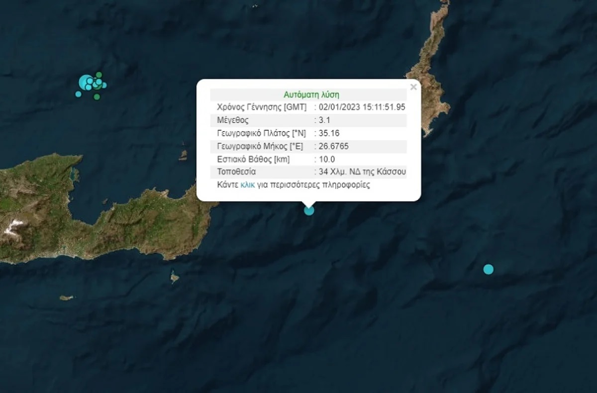 Νέος σεισμός σημειώθηκε στην Κρήτη και συγκεκριμένα 34χλμ ΝΔ της Κάσσου. Η δόνηση είχε μέγεθος 3,1 ρίχτερ, ενώ σύμφωνα με το Εθνικό Αστεροσκοπείο Αθηνών είχε εστιακό βάθος 10χλμ.