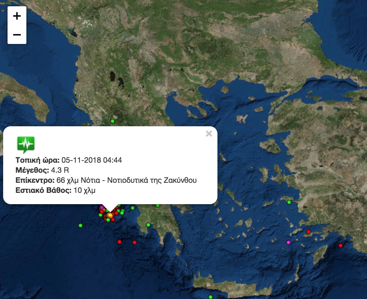 Το επίκεντρο της δόνησης εντοπίστηκε στον θαλάσσιο χώρο 70 χιλιόμετρα νότια-νοτιοδυτικά της Ζακύνθου και 287 χιλιόμετρα δυτικά-νοτιοδυτικά της Αθήνας, κατά την ίδια πηγή.