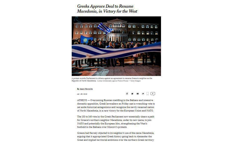 «Οι Έλληνες κύρωσαν τη συμφωνία για τη μετονομασία της Μακεδονίας, σε μια νίκη για τη Δύση» τιτλοφορείται το άρθρο των New York Times αναφορικά με τις πολιτικές εξελίξεις στην Ελλάδα μετά την υπερψήφιση της Συμφωνίας των Πρεσπών από το ελληνικό κοινοβούλιο.