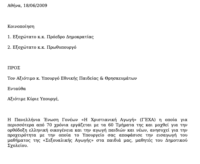 Το υπουργείο Παιδείας απέστειλε έγγραφο στα σχολεία ενημερώνοντας για την εκδήλωση με τίτλο «Σύγχρονη Παιδεία και Ελληνορθόδοξη Παράδοση» την οποία διοργανώνει παραθρησκευτική οργάνωση «Πανελλήνια Ένωση Γονέων “Η Χριστιανική Αγωγή”»,την Κυριακή 9 Φεβρουαρίου. Η οργάνωση είχε ζητήσει πριν λίγα χρόνια να απαγορευτεί το μάθημα της Σεξουαλικής Αγωγής από τα σχολεία.