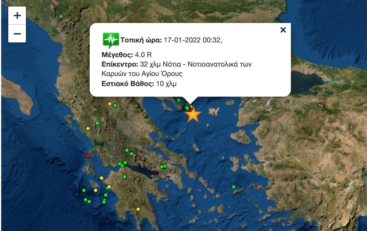 Την ίδια ώρα, σεισμική δόνηση 4,1 βαθμών της κλίμακας Ρίχτερ, ο οποία χαρακτηρίζεται χαρακτηρίζεται «ασθενής», σημειώθηκε στις 00:32 στον θαλάσσιο χώρο 22 χιλιόμετρα νότια του Άθου, ανακοίνωσε το Γεωδυναμικό Ινστιτούτο του Εθνικού Αστεροσκοπείου Αθηνών.