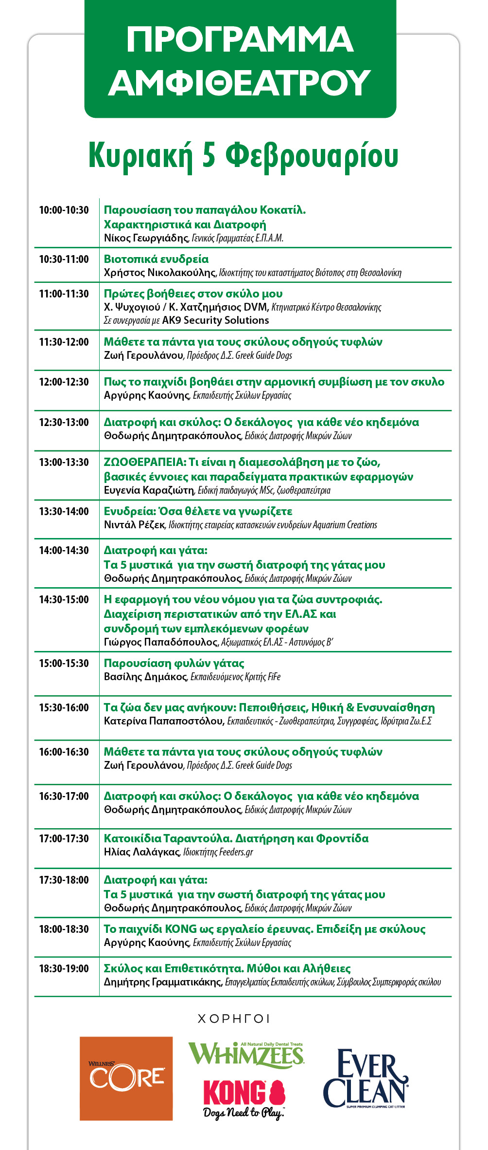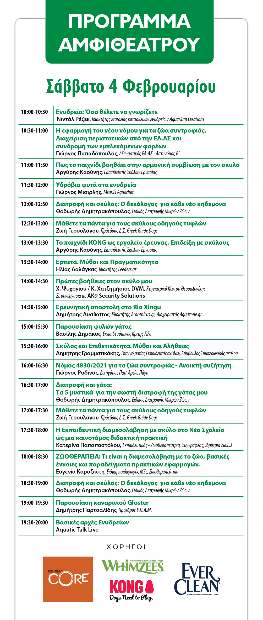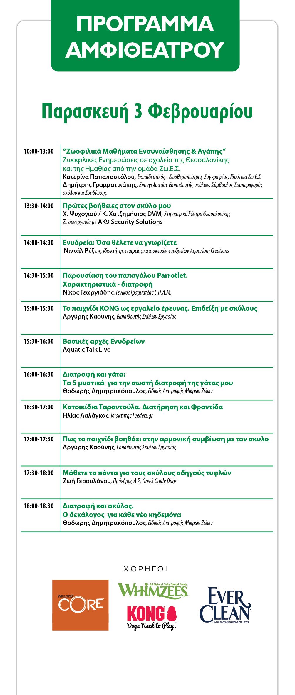 Στο Περίπτερο 5, από Παρασκευή 3 έως και Κυριακή 5 Φεβρουαρίου 2023, οι επισκέπτες θα έχουν την ευκαιρία να παρακολουθήσουν την 3πλή έκθεση μορφολογίας σκύλων που διοργανώνει ο Κυνοφιλικός Όμιλος ΠΕ Θεσσαλονίκης. Επίσης, θα συναντήσουν τις ειδικές ενότητες για τα ενυδρεία, τερράρια και πτηνά ενώ θα μάθουν και θα ρωτήσουν στην ενότητα “Αμφιθέατρο Γνώσεων” για την εκπαίδευση, τη διατροφή και την υγεία των ζώων συντροφιάς.