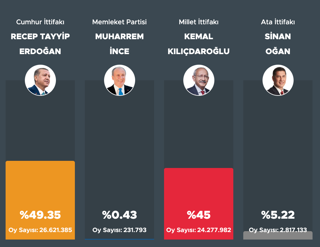 Αδιαμφισβήτητο φαβορί για τον δεύτερο γύρο των προεδρικών εκλογών στην Τουρκία φαντάζει ο Τούρκος πρόεδρος Ρετζέπ Ταγίπ Ερντογάν ο οποίος στο 98,4% της ενσωμάτωσης συγκεντρώνει 49,3% έναντι 45% του Κεμάλ Κιλιτσντάρογλου αν και οι δημοσκοπήσεις τον έφερναν στην πρώτη θέση.