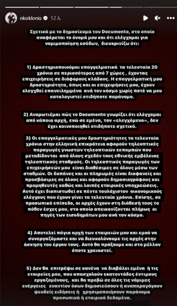 Ο Νίκος Κοκλώνης απάντησε μέσα από ανάρτησή του στο Instagram σε δημοσίευμα που τον εμπλέκει στην υπόθεση που ερευνά η Αρχή για το Ξέπλυμα Μαύρου Χρήματος, που είδε σήμερα το φως της δημοσιότητας.