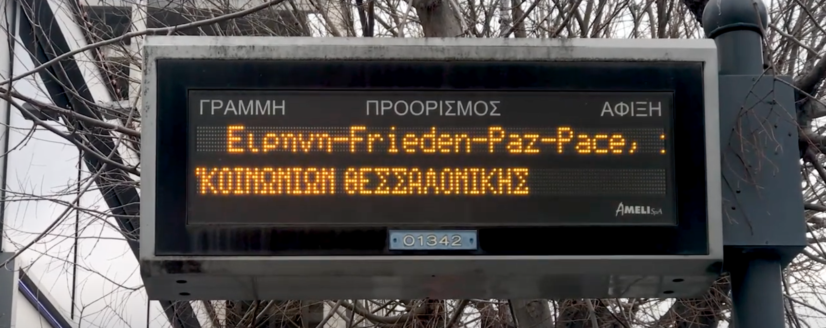 Στις πινακίδες μεταβαλλόμενου σήματος, στις στάσεις όπου λειτουργεί το σύστημα τηλεματικής του Οργανισμού, περνά από σήμερα Πέμπτη, 10 Μαρτίου, η λέξη ΕΙΡΗΝΗ στα ελληνικά και σε δέκα ακόμη γλώσσες: Peace (αγγλικά), Paqen (αλβανικά), Paix (γαλλικά), Frieden (γερμανικά), Paz (ισπανικά), Pace (ιταλικά), Beke (ουγγρικά) Myr (ουκρανικά), Mir (ρωσικά) Fred (σουηδικά). Στη Θεσσαλονίκη, στην πολυπολιτισμική Θεσσαλονίκη, ζουν άνθρωποι που κατάγονται από τη Ρωσία, ζουν άνθρωποι που κατάγονται από την Ουκρανία, ζουν άνθρωποι από σχεδόν κάθε γωνιά του πλανήτη.