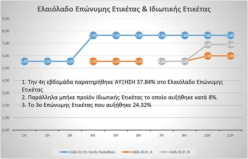 1.Την 4η εβδομάδα παρατηρήθηκε αύξηση 37,84% στο Ελαιόλαδο επώνυμης ετικέτας εκτός καλαθιού.