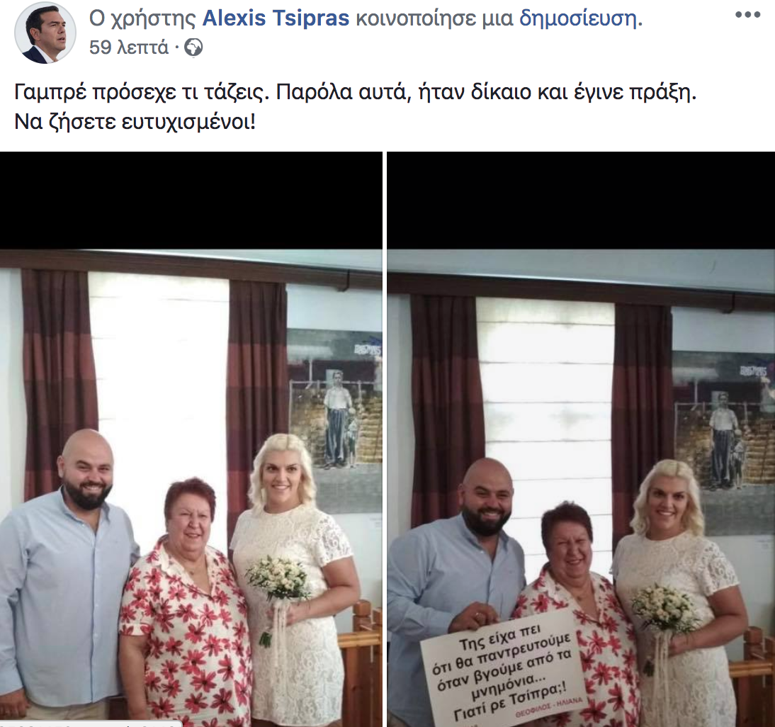 Οι ευχές του Αλέξη Τσίπρα σε ένα νιόπαντρο ζευγάρι, μέσω Facebook: