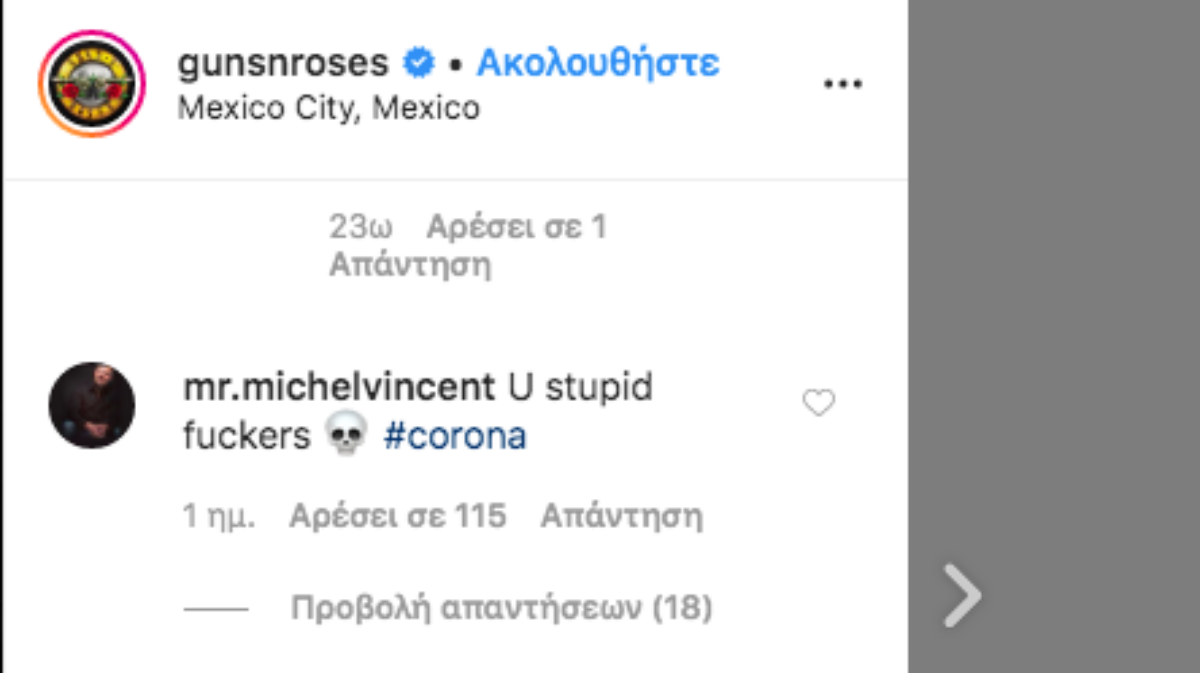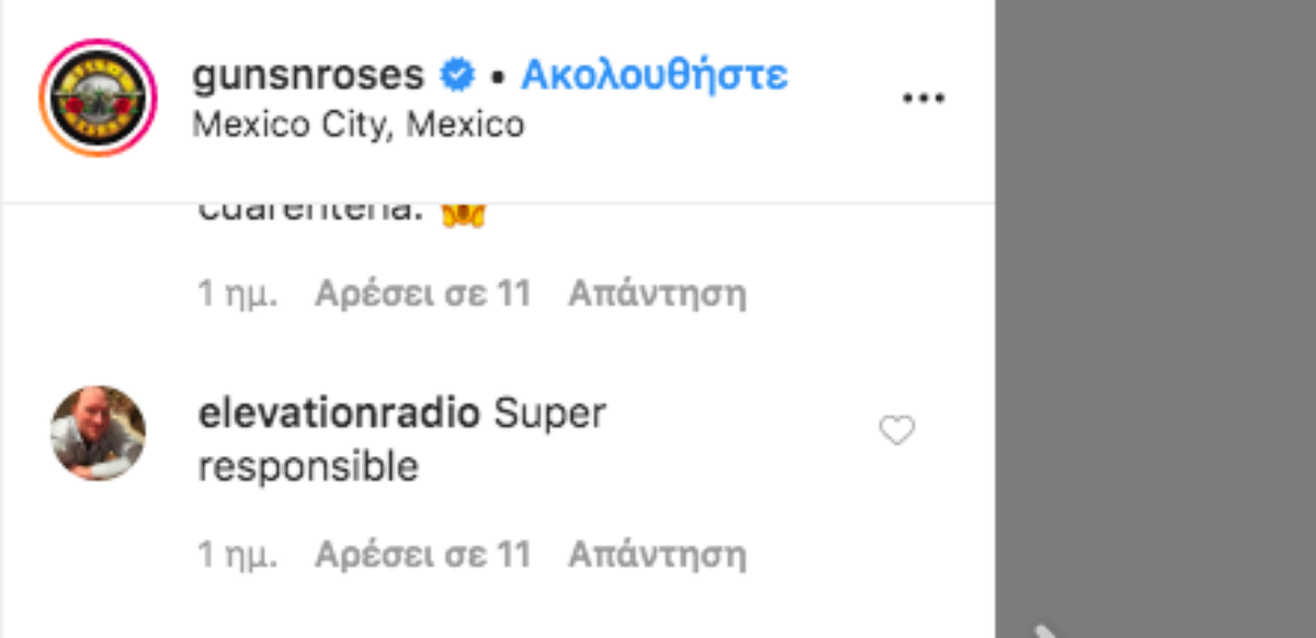 Οι Guns N’ Roses έδωσαν συναυλία το περασμένο σαββατοκυριακ, μπροστά σε 40.000 θεατές στο Μεξικό αψιφώντας την απειλή της μετάδοσης του κοροναϊού. Το συγκρότημα ανέβασε μία φωτογραφία από το φεστιβάλ και από κάτω ακολούθησαν σχολία οργής.