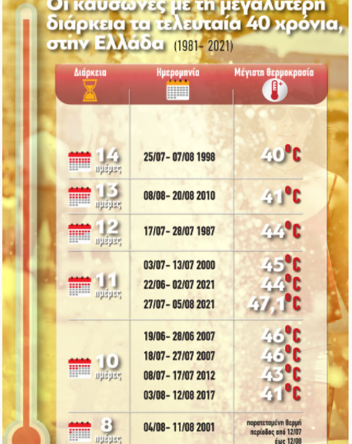 Το παρακάτω γράφημα αποτυπώνει στοιχεία του Εθνικού Αστεροσκοπείου Αθηνών/meteo.gr, για τους πιο «επίμονους» καύσωνες στη χώρα από το 1981: