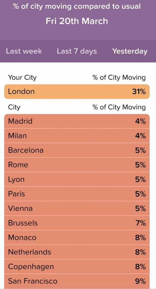 Το ποσοστό των κατοίκων που μετακινήθηκαν την Παρασκευή σε μεγάλες πόλεις. Αναμένεται τσουνάμι Covid-19 στα νοσοκομεία του Λονδίνου τις επόμενες ημέρες.