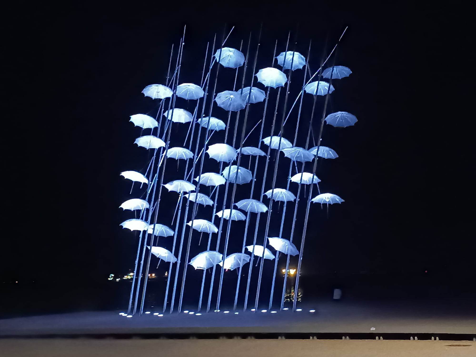 Οι “Ομπρέλες” του Γιώργου Ζογγολόπουλου φωταγωγήθηκαν συμβολικά απόψε στα χρώματα του κίτρινου, του πορτοκαλί και του σιέλ για να τιμήσουν τη μνήμη του Άλκη Καμπανού.