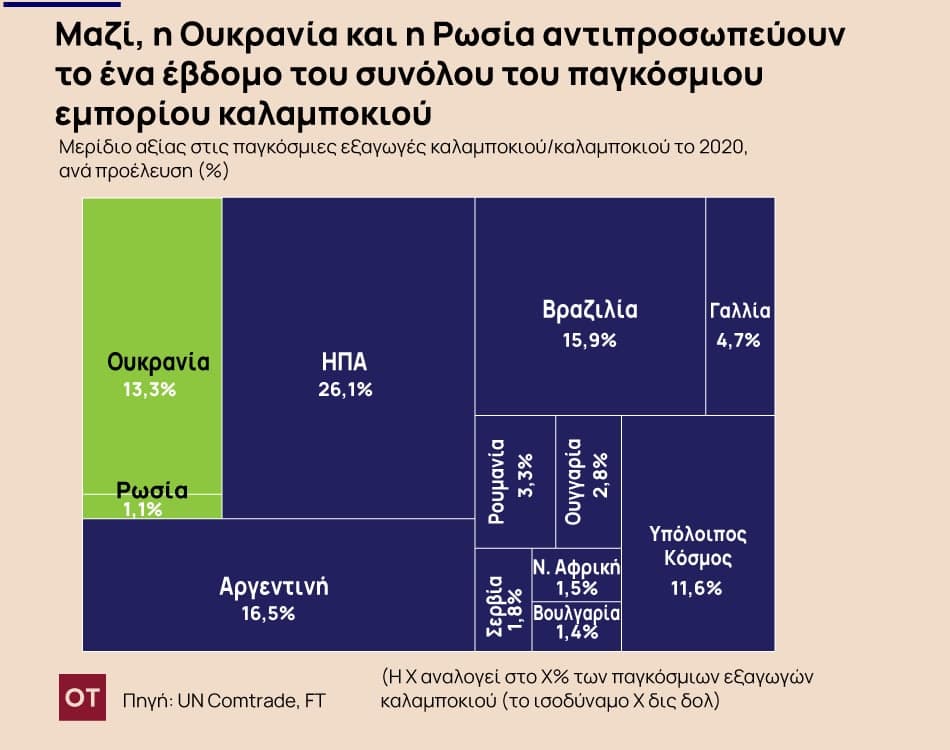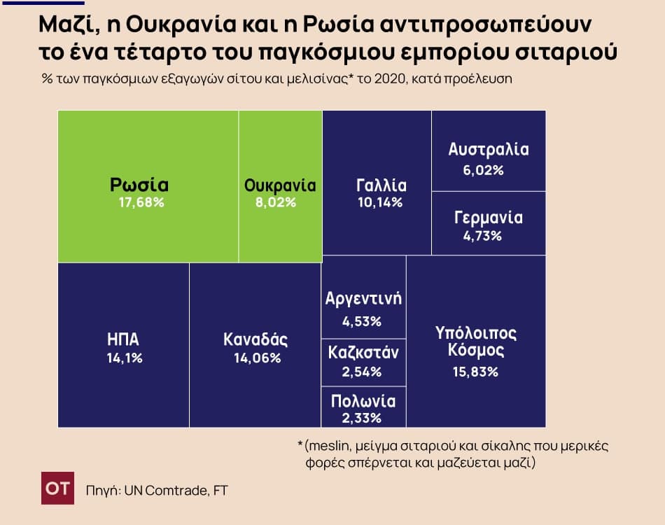 Μαζί με τη Ρωσία, η Ουκρανία είναι ο κορυφαίος προμηθευτής σιτηρών και ηλιελαίου στις παγκόσμιες αγορές, αντιπροσωπεύοντας λίγο λιγότερο από το ένα δέκατο των παγκόσμιων εξαγωγών σιταριού, περίπου το 13 τοις εκατό του καλαμποκιού και περισσότερο από το ήμισυ της αγοράς ηλιελαίου, σύμφωνα με την UN Comtrade. Οι τιμές των εμπορευμάτων εκτινάχθηκαν στα ύψη μετά την εισβολή της Ρωσίας, με το σιτάρι κάποια στιγμή να φτάνει στο υψηλότερο επίπεδο όλων των εποχών.