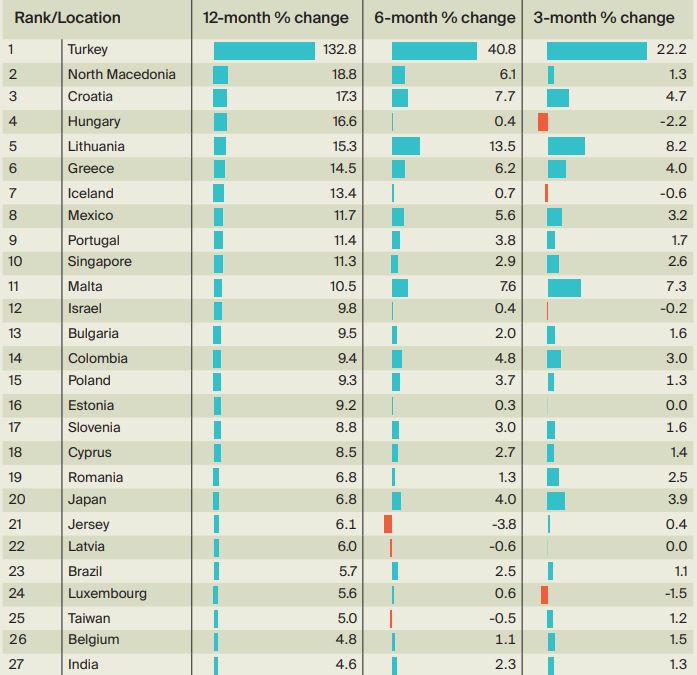 Κατά τα άλλα, οι χώρες της Ανατολικής και Νοτιοανατολικής Ευρώπης κυριαρχούν στο top10 της Knight Frank, με τη Β. Μακεδονία να παρουσιάζει αύξηση 18,8% στις τιμές, την Κροατία 17,3% και την Ουγγαρία 16,6%.