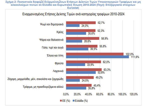 Η μεγαλύτερη διαφορά καταγράφεται στα αρτοποιήματα και δημητριακά με την Ελλάδα να έχει κατά 54% μικρότερη αύξηση τιμών από την Ευρωπαϊκή Ένωση, στα γλυκά και ζαχαρώδη με την Ελλάδα να έχει 50% μικρότερη αύξηση και στα Φρούτα με την Ελλάδα να έχει 45% μικρότερη αύξηση.