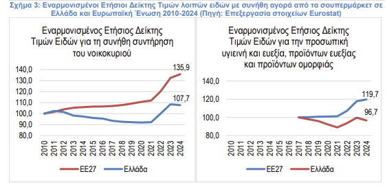 Όσον αφορά τις κατηγορίες εκτός τροφίμων που βρίσκουμε στα σουπερμάρκετ, οι διαφορές είναι ακόμα μεγαλύτερες σε σχέση με την Ευρωπαϊκή Ένωση. Για την κατηγορία των ειδών φροντίδας για το σπίτι (απορρυπαντικά, καθαριστικά κλπ), η αύξηση που καταγράφεται στην Ελλάδα είναι 7,7% την τελευταία 15ετία έναντι 35,9% στην Ευρωπαϊκή Ένωση, με αρκετά έτη να καταγράφεται μείωση.