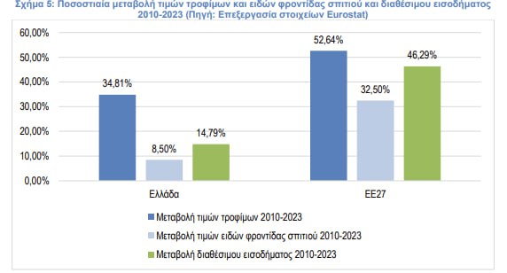 Την ίδια περίοδο στην Ευρωπαϊκή Ένωση οι τιμές τροφίμων αυξήθηκαν μεν κατά 52,64%, κατά 51% δηλαδή περισσότερο από την Ελλάδα, αλλά το διαθέσιμο εισόδημα την περίοδο 2010-2023 αυξήθηκε κατά 46,29%, από 19.174 ευρώ σε 28.050 ευρώ κατά κεφαλήν και 214% περισσότερο από ότι στην Ελλάδα.
