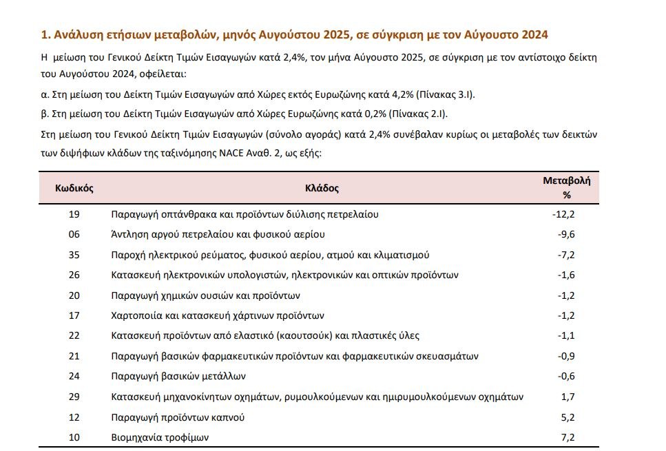Κατά τα άλλα, ο δείκτης τιμών χονδρικής των εισαγόμενων ειδών, σημείωσε ετήσια μείωση τον Αύγουστο, κατά -2,4% (έναντι μείωσης -4,3% μεταξύ 2024-2023).