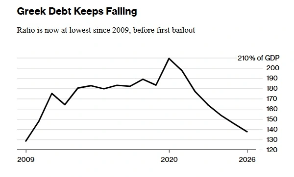 Την εκτίμηση ότι χρέος της Ελλάδας έχει μειωθεί στο χαμηλότερο επίπεδο σε σύγκριση με το 2009 όταν και εκδηλώθηκε η οικονομική κρίση κάνει το Bloomberg, το οποίο σε ρεπορτάζ του αναφέρεται με θετικά λόγια για την πορεία της ελληνικής οικονομίας.
