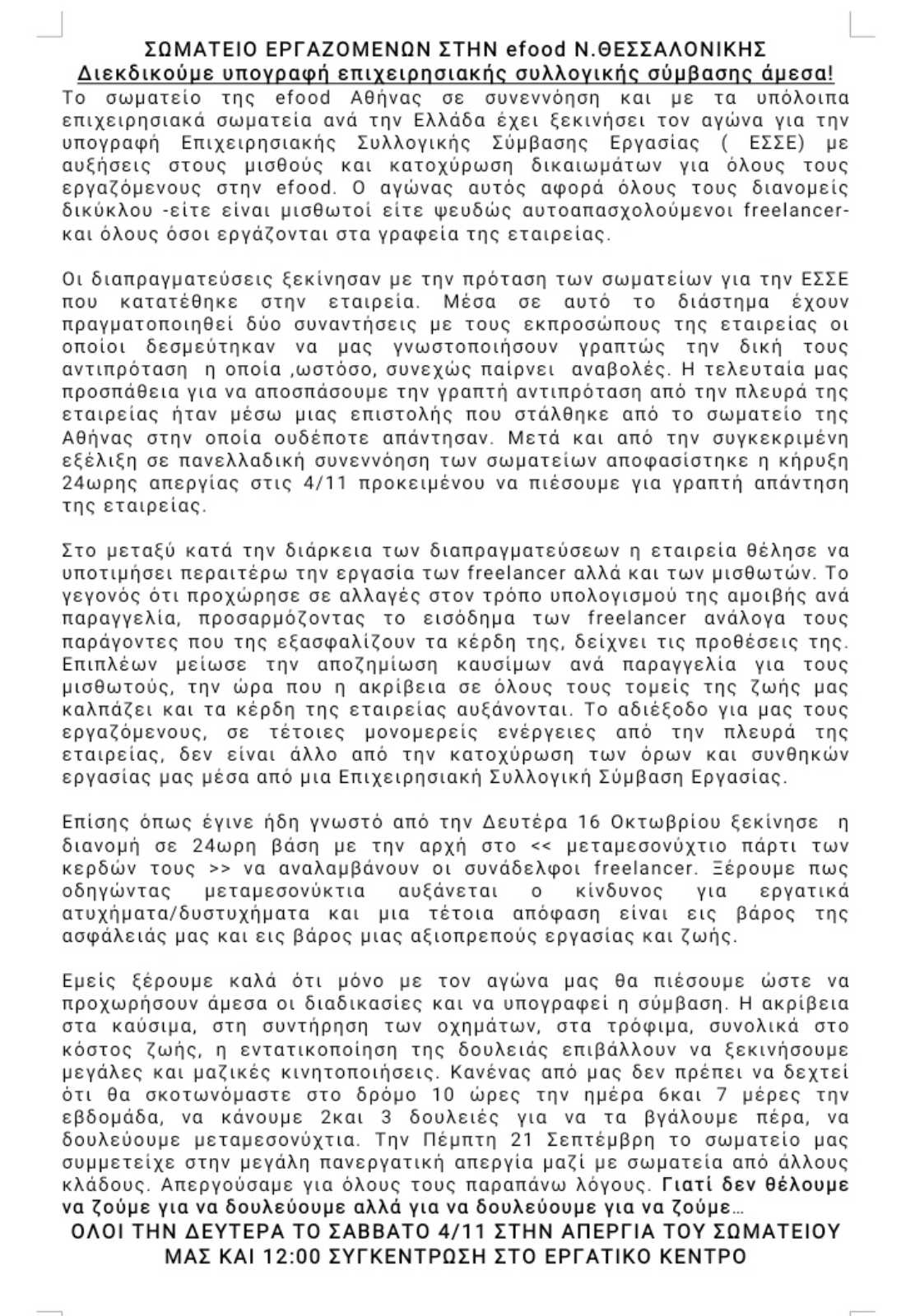 Σε 24ωρη απεργία προχωρούν οι εργαζόμενοι της efood με αιτήματα την υπογραφή επιχειρησιακής συλλογικής σύμβασης, aυξήσεις στους μισθούς και κατοχύρωση δικαιωμάτων για όλους τους εργαζόμενους στην εταιρεία.