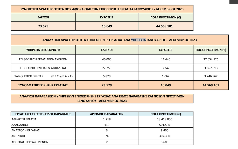 Επιθεώρηση Εργασίας: Ιστορικό ρεκόρ ελέγχων το 2023 με πρόστιμα 44,5 εκατ. ευρώ