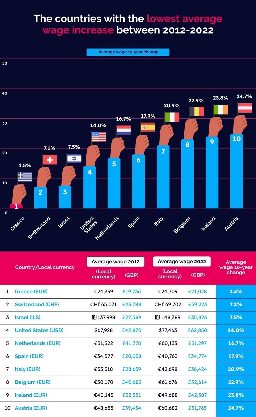 Αναλυτικά, η Ελλάδα έχει την μικρότερη μέση αύξηση των μισθών την τελευταία δεκαετία, με τον μέσο μισθό να αυξάνεται μόλις κατά 1,5%.