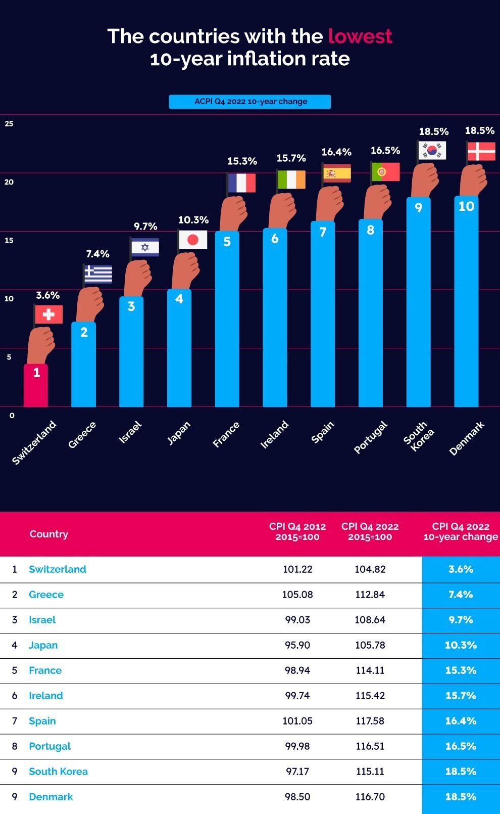 Παρ’ όλα αυτά, η Ελλάδα έχει και τον δεύτερο χαμηλότερο 10ετή πληθωρισμό ανάμεσα στις χώρες του ΟΟΣΑ, πίσω από την Ελβετία και μπροστά από το Ισραήλ, έχοντας καταγράψει αύξηση της τάξης του 7,4% σε περίοδο δεκαετίας.