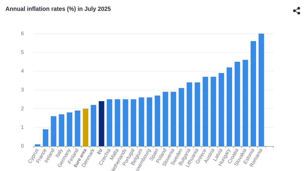 Σταθερός στο 2% παρέμεινε ο πληθωρισμός στην Ευρωζώνη τον Ιούλιο, σύμφωνα με στοιχεία της Eurostat, παραμένοντας αμετάβλητος σε σχέση με τον Ιούνιο και καταγράφοντας αποκλιμάκωση 0,6% σε σύγκριση με τον Ιούλιο του 2024 (2,6%). Στην Ευρωπαϊκή Ένωση, ο πληθωρισμός ανήλθε στο 2,4%, ελαφρώς αυξημένος από το 2,3% του Ιουνίου, αλλά χαμηλότερος σε σχέση με το 2,8% του Ιουλίου 2024.
